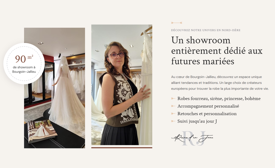 Reine D’un Jour est votre destination privilégiée pour des robes de mariées uniques et de qualité dans le Nord-Isère. Découvrez votre future robe de mariée à Bourgoin-Jallieu. Showroom élégant, créateurs européens, accompagnement personnalisé et retouches sur-mesure.